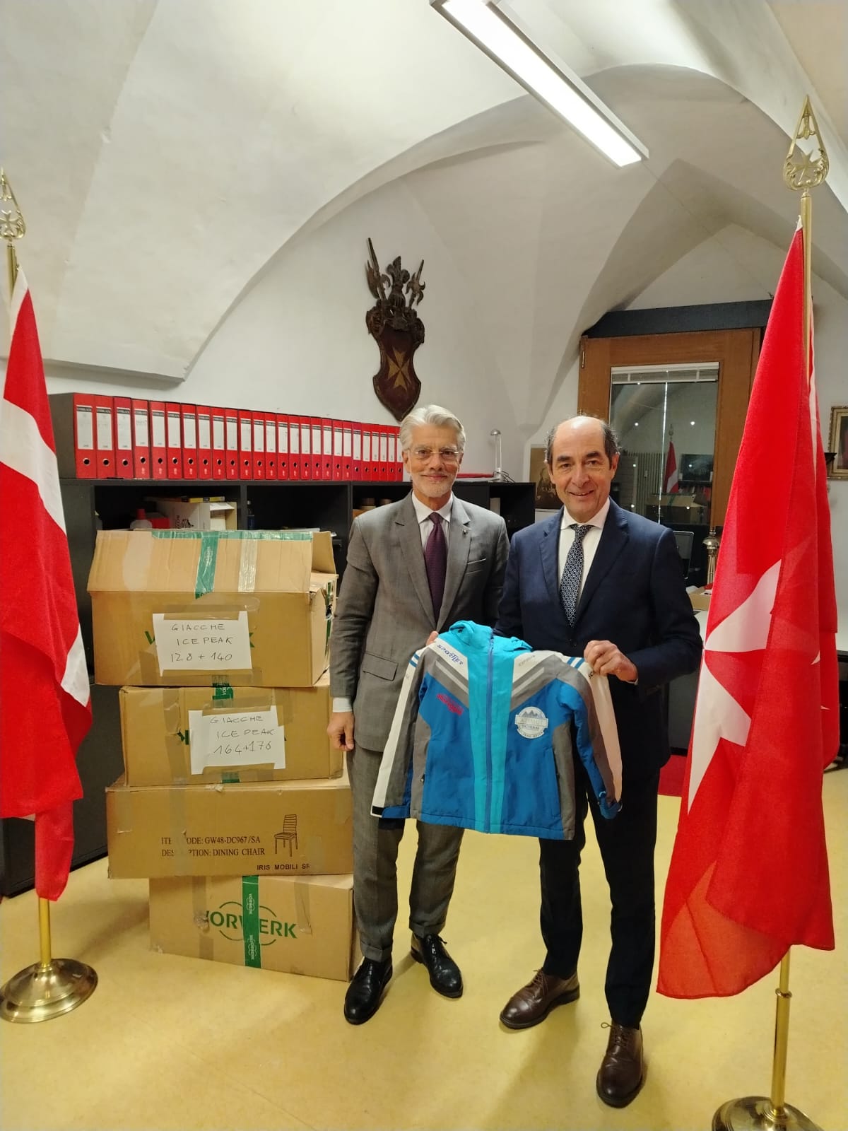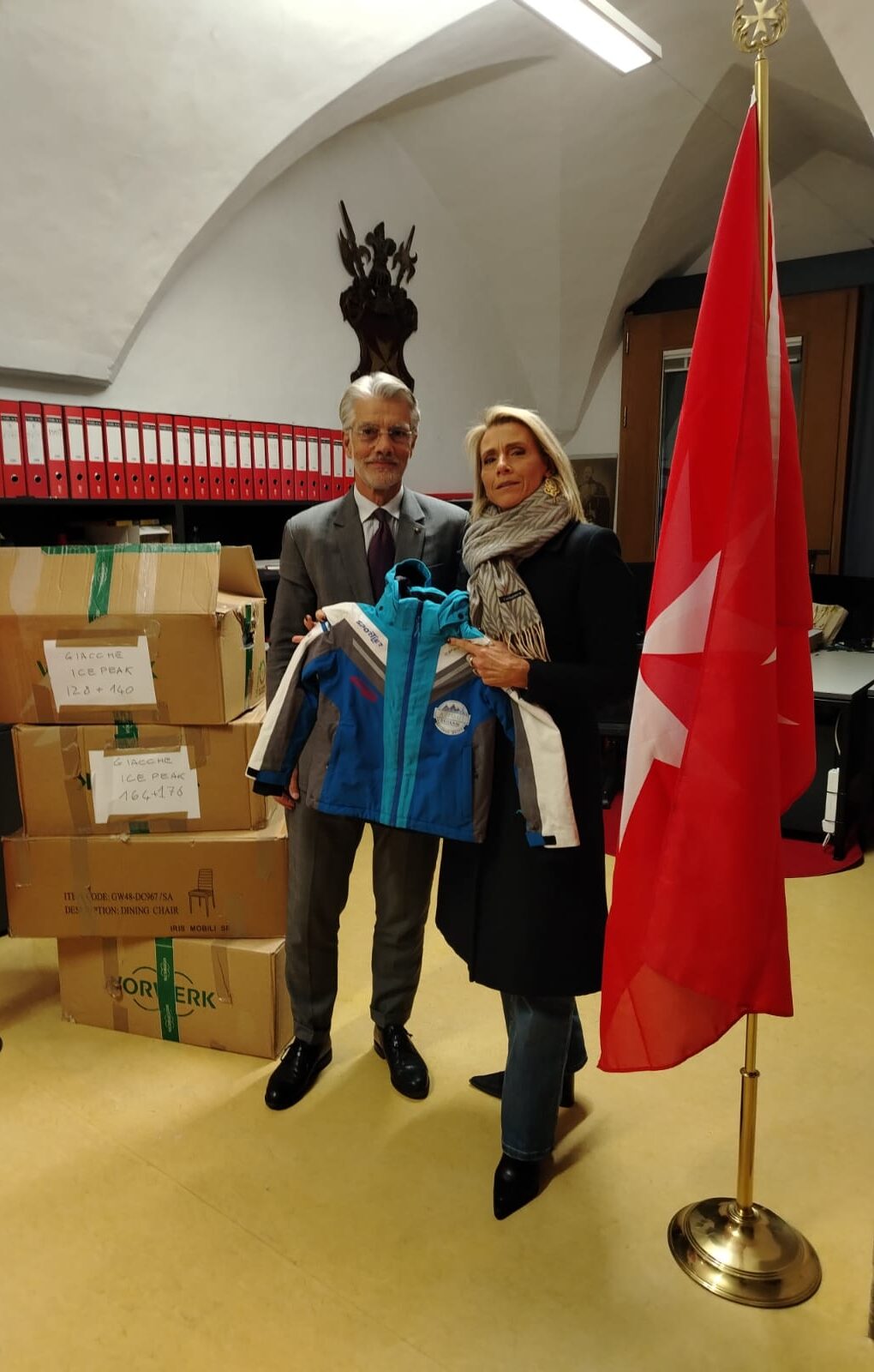 Grazie alle donazioni private, la delegazione di Bolzano del Sovrano Ordine di Malta ha potuto inviare una certa quantità di teloni, numerosi televisori, generi alimentari e abbigliamento per bambini alle popolazioni bisognose dell’Ucraina e di Gaza. Una donazione particolarmente preziosa riguarda la fornitura di unità di illuminazione e alimentazione supplementari a parete per undici camere di degenza. Queste unità vengono montate a parete e consentono il passaggio di corrente a bassa e alta tensione, connessioni dati e di comunicazione, nonché gas medicali. Le guide di supporto possono anche ospitare apparecchiature mediche. Anche questa iniziativa è stata resa possibile dai nostri donatori. È stata coordinata da Davide Boriotti con il sostegno dei membri – cavalieri e dame – del nostro Ordine e del Corpo Militare del Sovrano Ordine di Malta. Poco fà abbiamo ricevuto la consegna di 4 scatoloni di giacche invernali per bambini e giovani dal Ski-Team-Azimut.