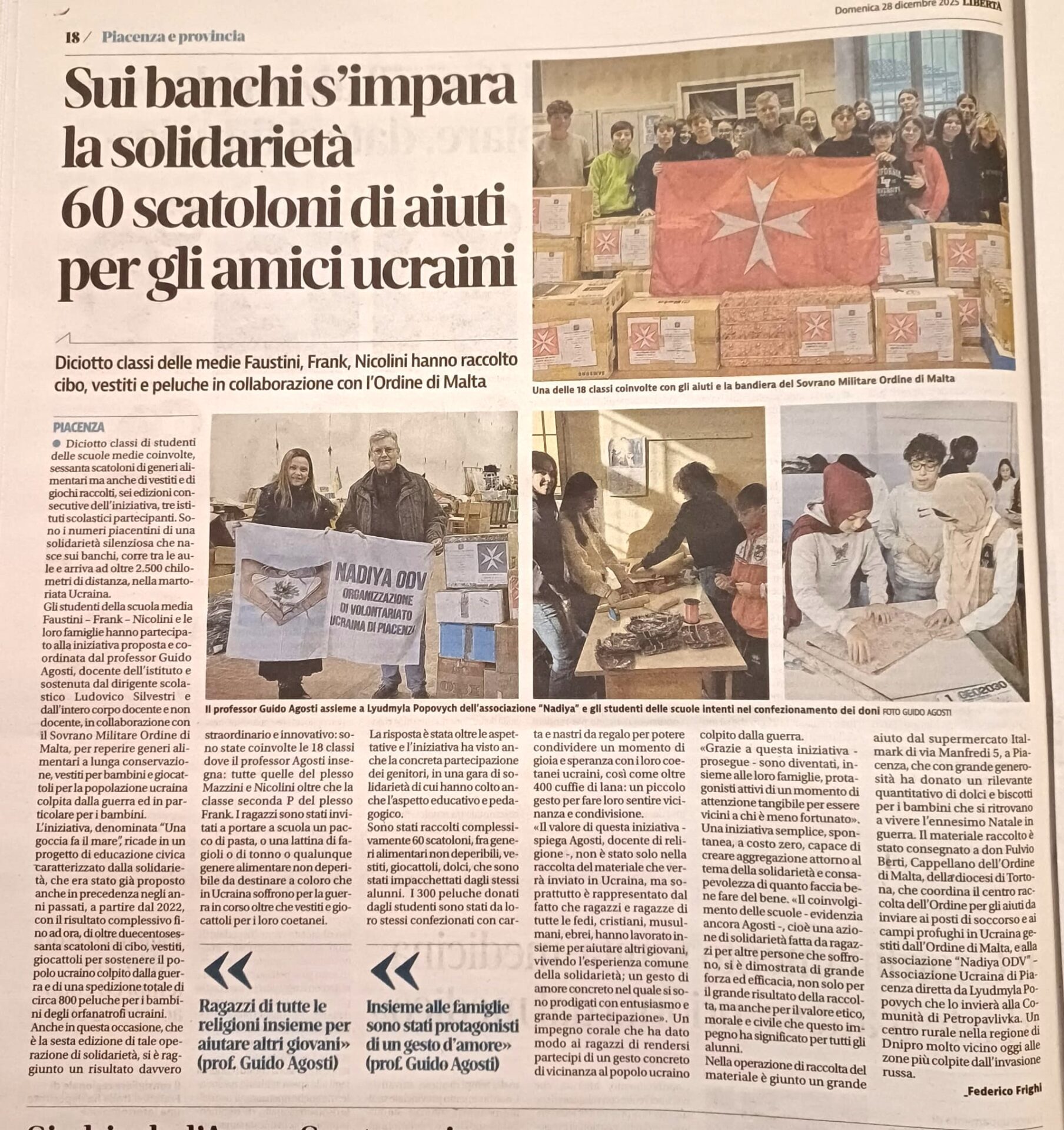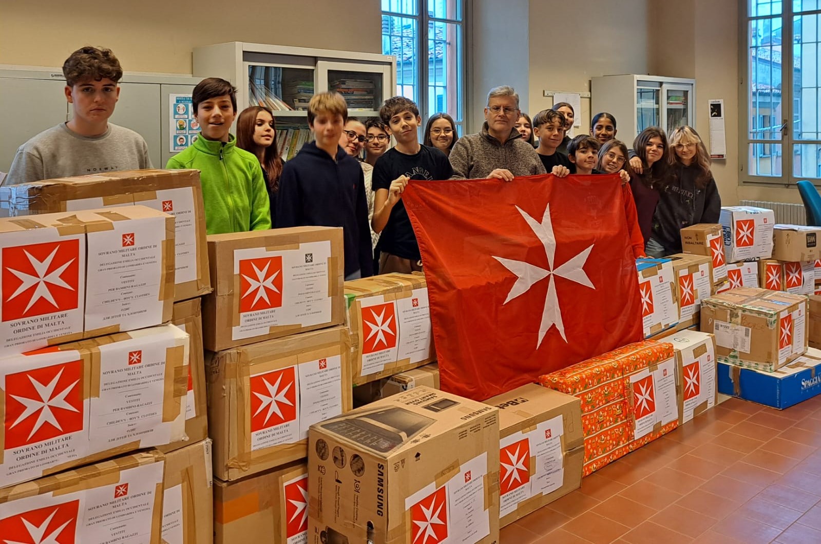 A Piacenza gli studenti della scuola media Faustini – Frank – Nicolini e le loro famiglie hanno partecipato anche quest’anno alla iniziativa proposta e coordinata dal Professor Guido Agosti, Cavaliere di Grazia Magistrale e docente dell’Istituto, promossa e sostenuta dalla Delegazione per l’Emilia Occidentale dell’Ordine di Malta, per reperire generi alimentari a lunga conservazione, vestiti e giocattoli per la popolazione ucraina colpita dalla guerra e in particolare per i bambini.