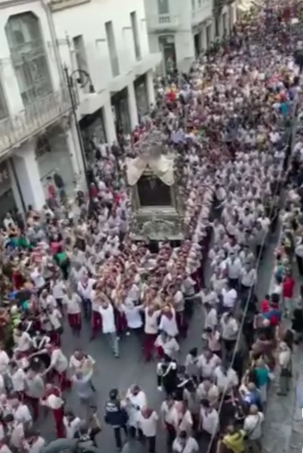 La Vara, accompagnata da canti e preghiere, scende verso il Duomo tra due ali di fedeli, in un clima che alterna solennità, silenzio e invocazione corale. È un rito che si rinnova ogni anno, ma che affonda le sue radici nella storia civile e religiosa della comunità reggina.