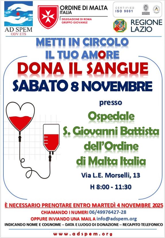 L’Ordine di Malta, tramite il Gruppo Giovanile della Delegazione di Roma e in collaborazione con l’associazione Ad Spem, ha organizzato una mattinata dedicata alla donazione di sangue.